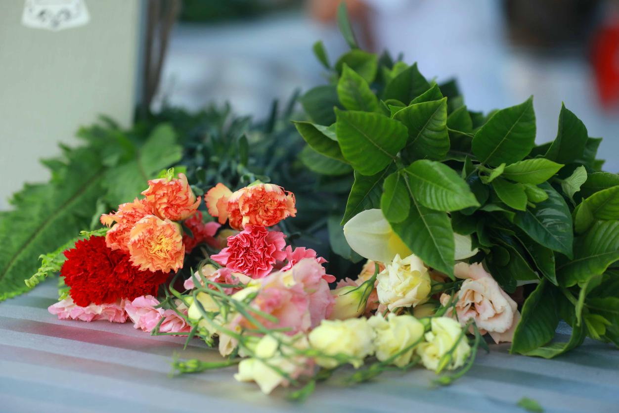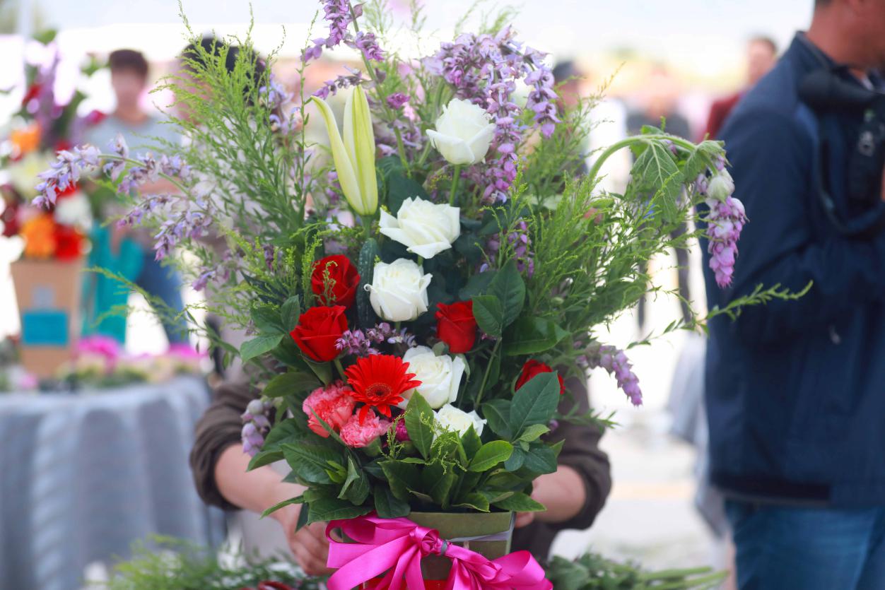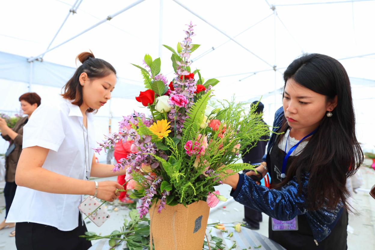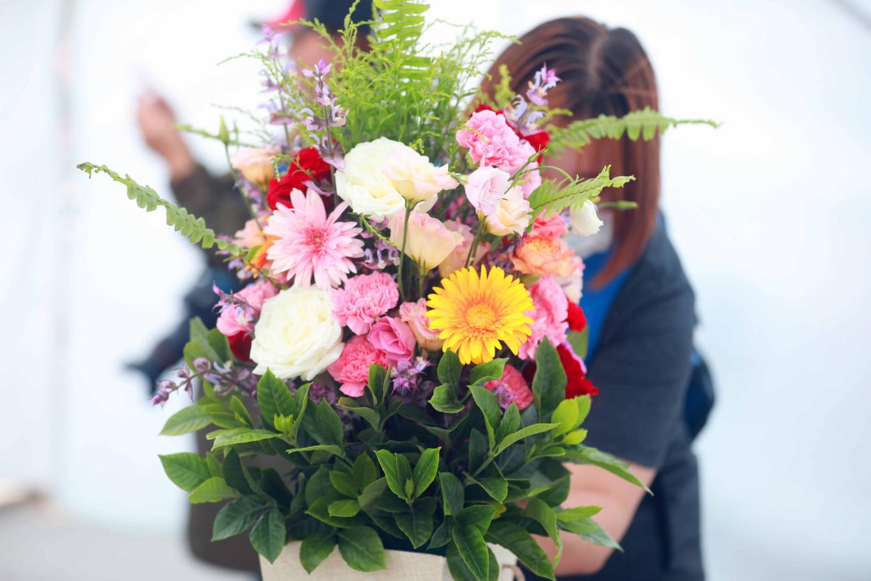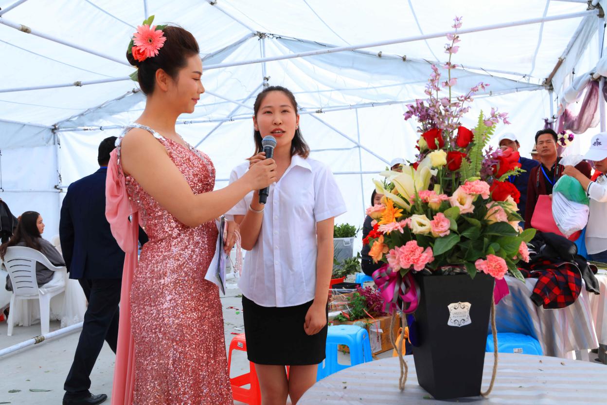 “插花比赛第一名在接受主持人的采访”