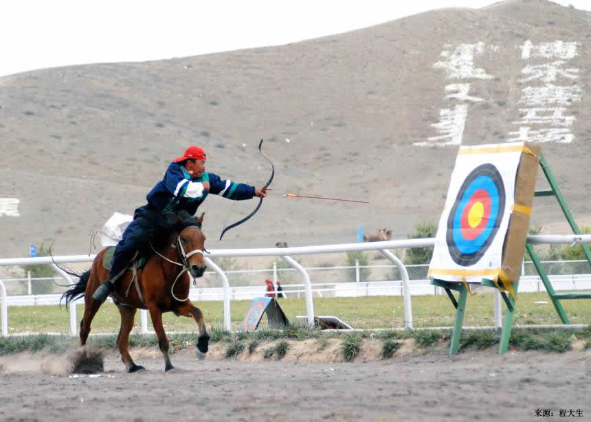 新疆蒙古、锡伯、哈萨克等民族都有 跑马射箭的历史传统。至今,锡伯族人民 还普遍喜欢射箭,以此作为民族体育运动 的主要项目。伊犁河南岸的察布查尔锡伯 自治县就是闻名全国的”箭乡”。在这里, 锡伯族家家有弓箭,人人自幼学射箭。重大节庆日,县城的箭厅,乡村的箭场,都 举行赛箭盛会。小小村庄也立起木杆,挂 上射靶,射手们用自已精心制作的弓箭参 赛献技。输家要当众宰羊烹肉,请赢家及众乡亲们共享欢乐。