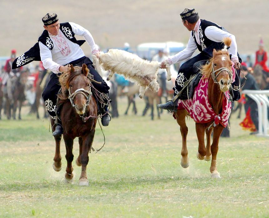 俗称“马上篮球”,是哈萨克、塔吉克、柯尔克孜等少数民族共同喜爱的传统活动。自1985年起,列为正式比赛项目,并制定了比赛规则:比赛场地为直道,长1-000米;每队10人(马),6人(马)上场比赛,4人(马)为替补;全场比赛胜负以将羊投入对方“羊轮”次数多者为胜。