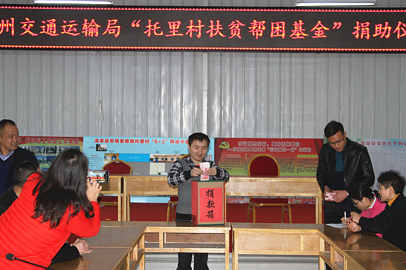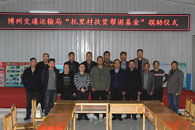 10月17日第四个“全国扶贫日”之际,为全方位落实各级党委脱贫攻坚各项安排布署,博州交通运输局将托里村扶贫帮困作为一场攻坚硬仗,百倍用心,千倍用力,多角度全方位精准发力,建立扶贫新机制,结合“访惠聚”所住村队温泉县安格里格镇托里村贫困人口多、无劳动能力家庭户多等特点,组织局干部职工、村两委干部及党员和新疆交通建设集团股份有限公司、重庆巨能建设集团有限公司等7家交通项目建设施工企业,在温泉县托里村开展了“人人都是扶贫使者,个个都是济困力量”为主题的捐赠活动,启动设立“托里村扶贫帮困基金”。