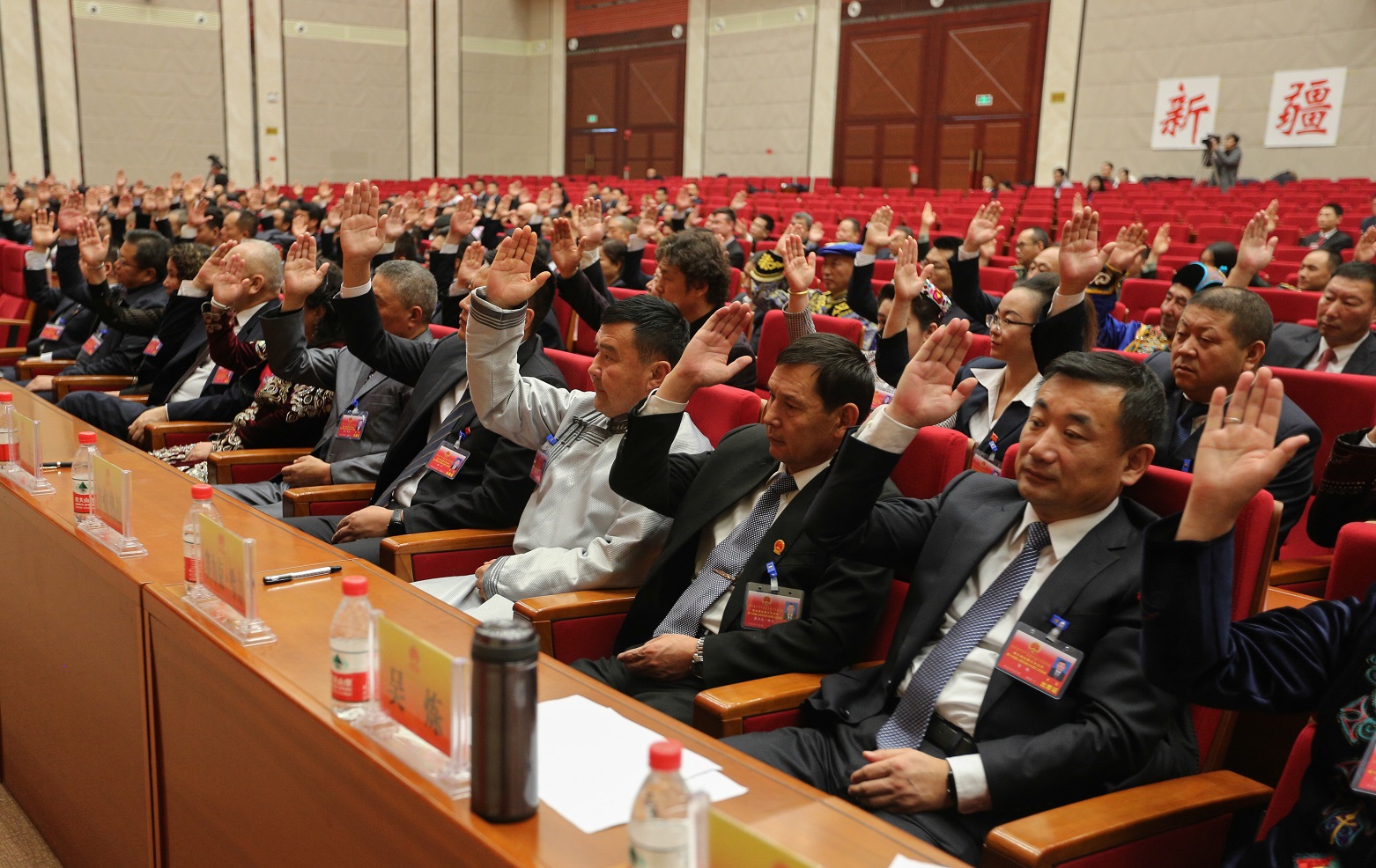 自治州十四届人大二次会议闭幕会上,代表们举手表决通过有关决议。 (记者于苏甫·艾尼 摄)