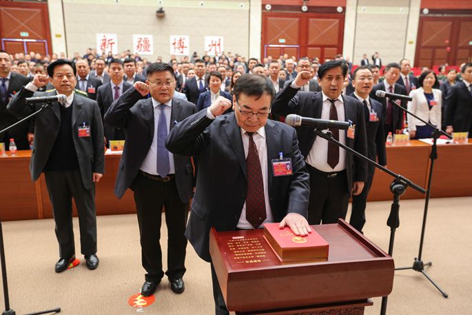 自治州十四届人大二次会议选举产生博州首任监察委员会主任斯迪克江·马木提(二排右起第一),进行宪法宣誓